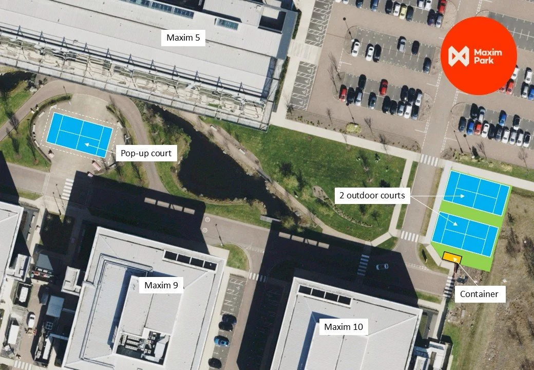 Maxim Park. Padel Courts. Padel growth in UK. Edinburgh Park. Two potential locations? Court dimensions. Maxim 5 Plaza. Maxim 10 gap site. Pop-up court? Permanent courts? Covered courts.